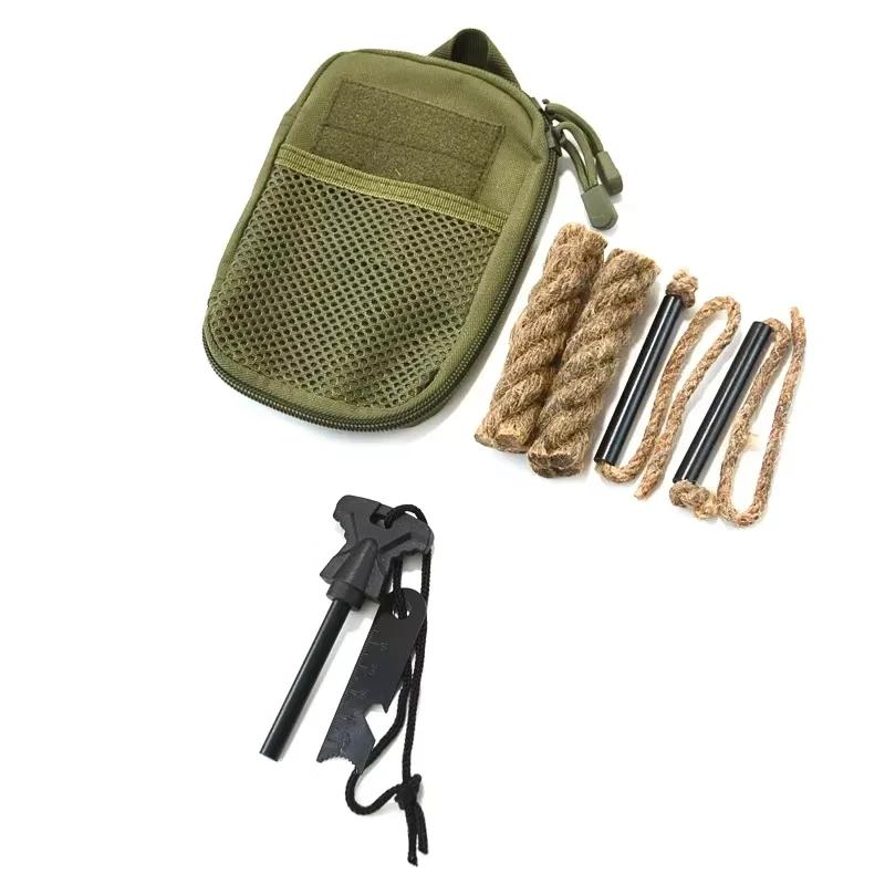 Ce kit complet comprend une barre de magnésium avec grattoir, deux morceaux de corde en chanvre traitée pour faciliter l’allumage, ainsi qu’une pochette MOLLE robuste permettant de l’attacher facilement sur un sac, une ceinture ou un gilet tactique.
